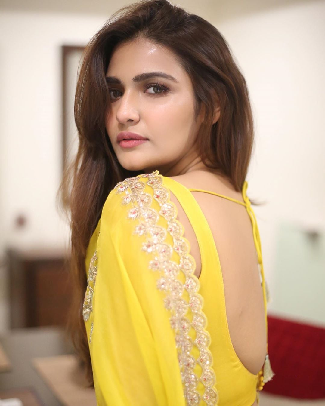 Arthi Venkatesh backless yellow saree.
